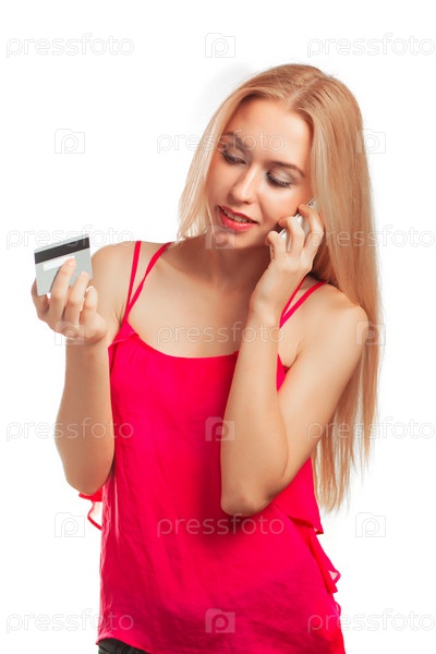 Молодая женщина говорит по телефону с кредитной картой в руке