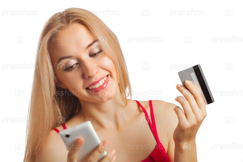Молодая женщина говорит по телефону с кредитной картой в руке