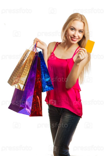 Молодая женщина держит подарочную карту и покупки
