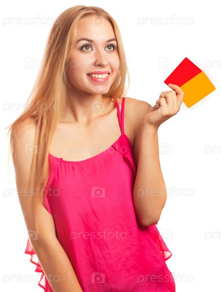 Молодая женщина держит подарочную карту