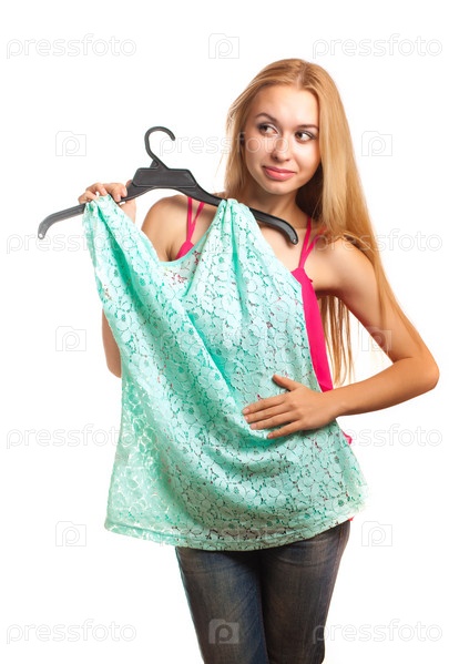 Женщина примеряет блузку