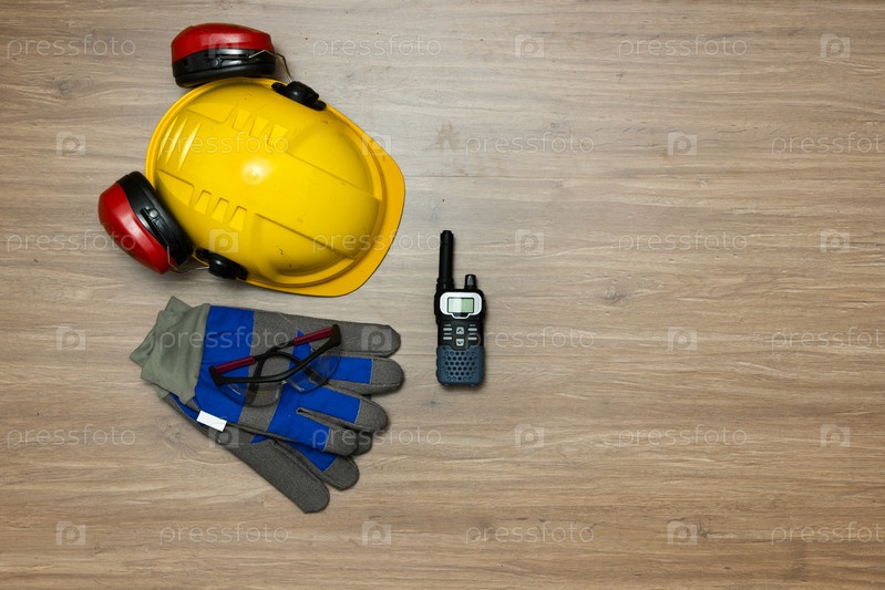 Каска, рация и защитные перчатки