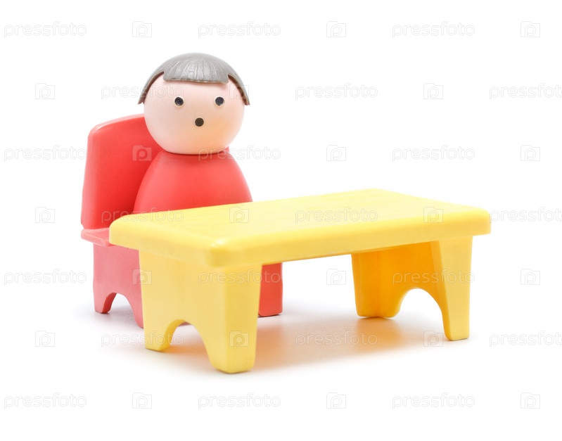 Игрушечный ребенок сидит за столом