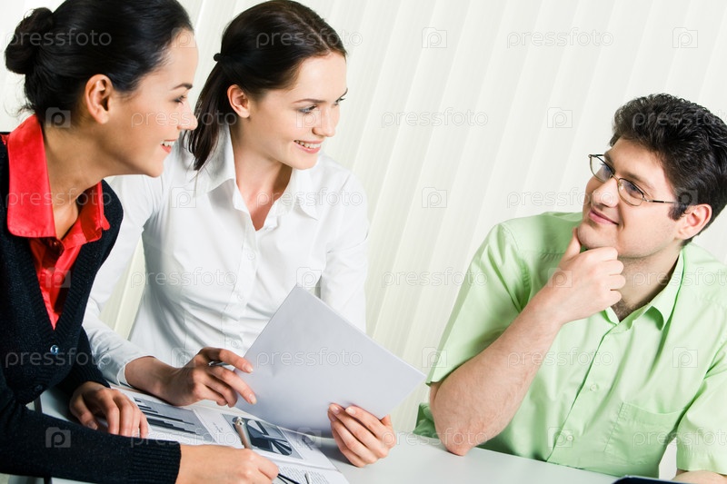 Портрет трех коллег, сидящих в офисе и делящихся своими идеями о бизнес-проекте