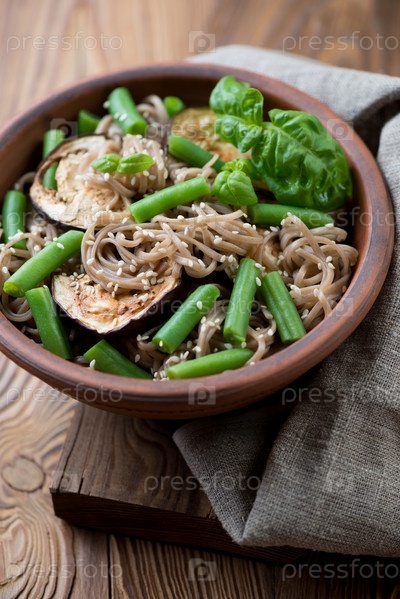Соба с баклажанами, зеленой фасолью и кунжутом