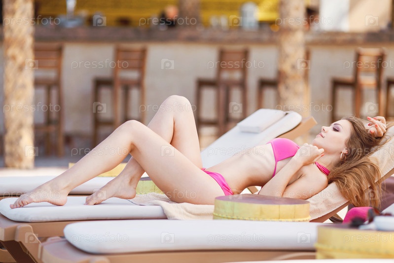Молодая женщина лежит на шезлонге у моря