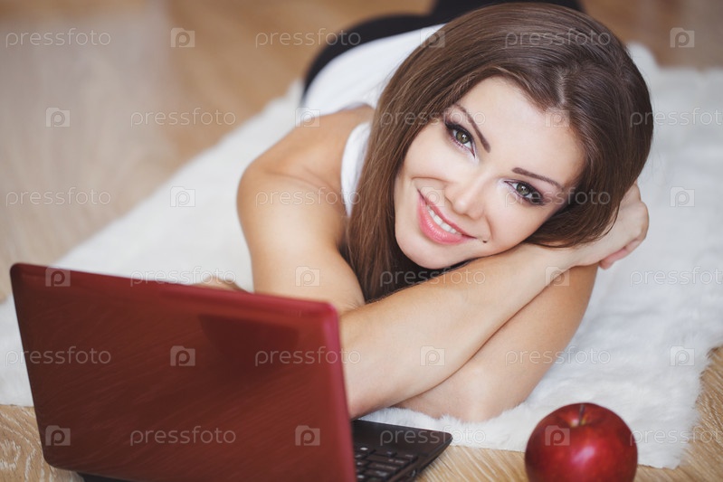 Девушка с ноутбуком лежит на полу