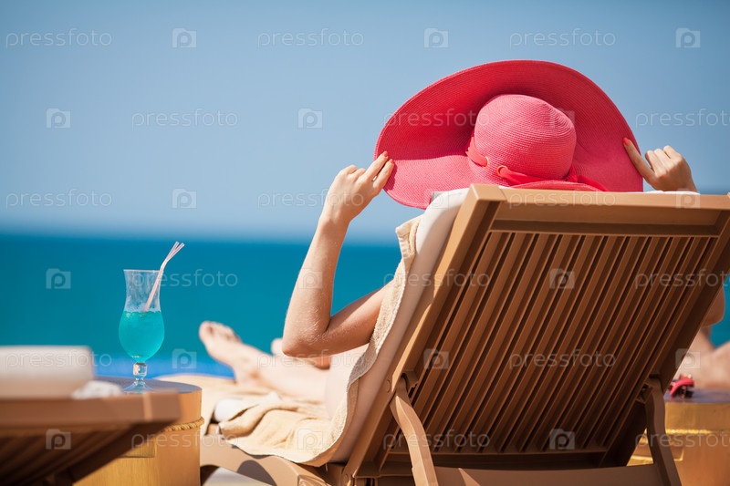 Молодая женщина лежит на шезлонге у моря