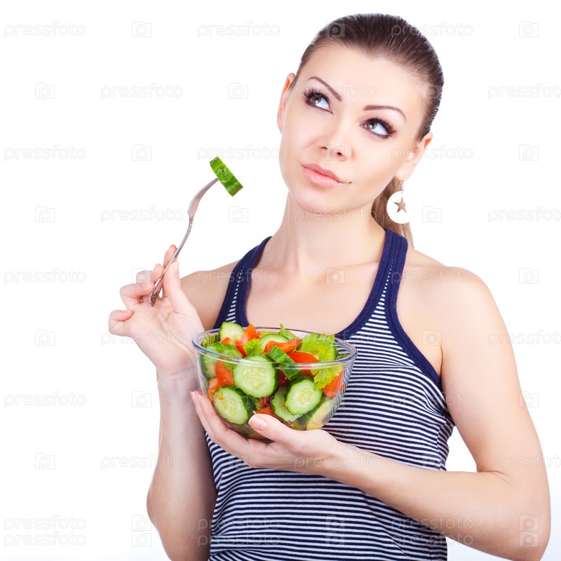 Девушка ест салат из свежих овощей