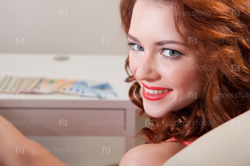 Красивая деловая женщина считает деньги за столом