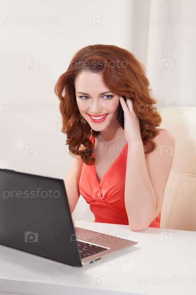 Женщина разговаривает по телефону за столом