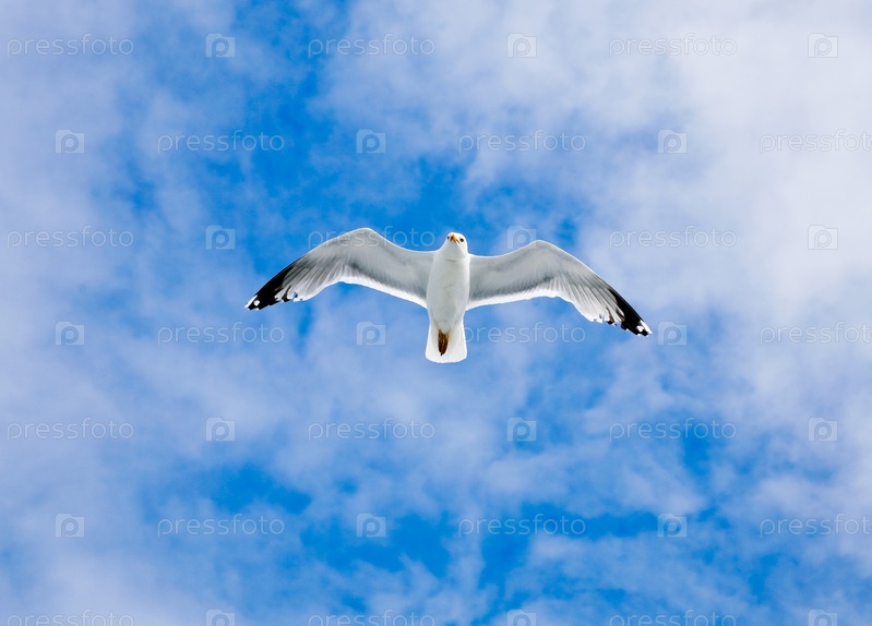 Чайка парит в облачном небе