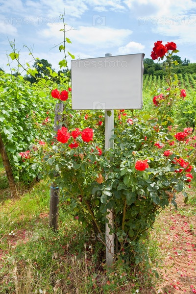 Куст роз и пустая табличка возле виноградника в Эльзасе, Франция