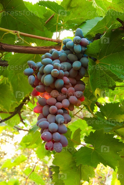Зрелый сочный кластер винограда в среде листьев и лозы
