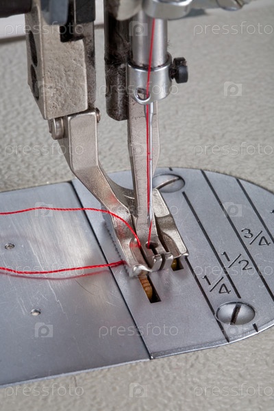 Игла с красной нитью и прижимная лапка швейной машины крупным планом