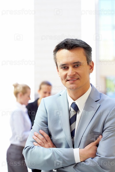 Бизнесмен возле офисного здания на фоне своих коллег