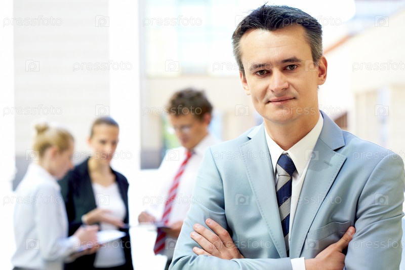 Бизнесмен возле офисного здания на фоне своих коллег