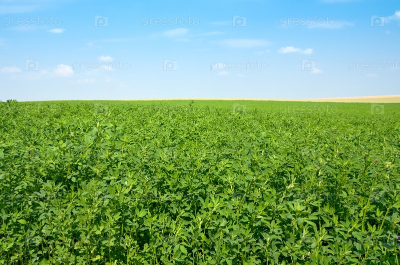 Зеленое поле люцерны под голубым небом летним днем, Франция