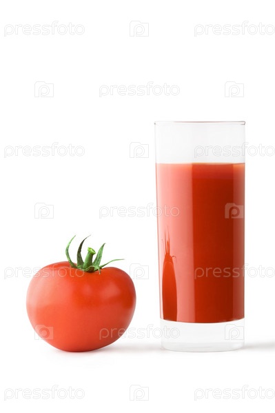 Стеклянный стакан с томатным соком и спелый помидор на белом фоне