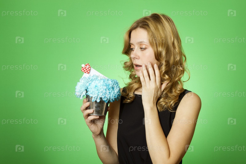 Портрет девушки с букетом хризантем и открыткой на зеленом фоне
