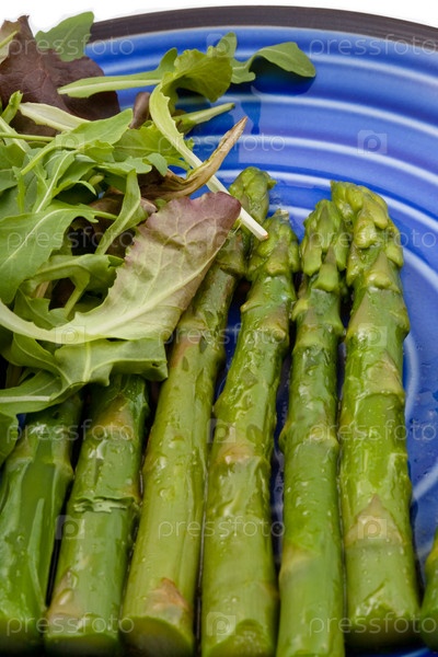 Вареная спаржа с салатом на синей тарелке
