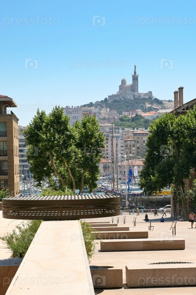 Вид на порт и Нотр-Дам де ла Гард в Марселе, Франция