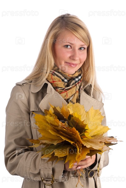 Женщина с желтыми листьями на белом фоне