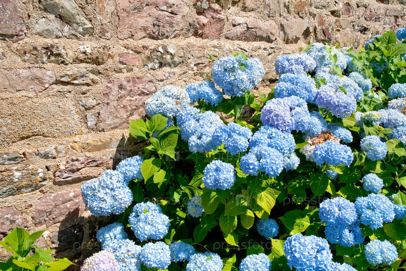 Голубые гортензии растут возле каменной стены в Бретани, Франция