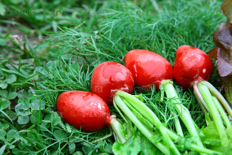 Редис на фоне зеленой травы