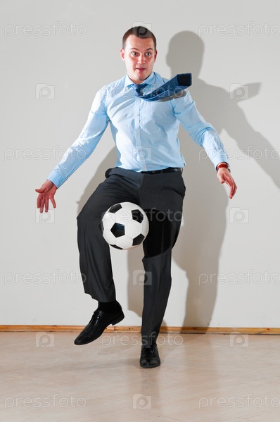 Деловой человек играет в футбол в офисе
