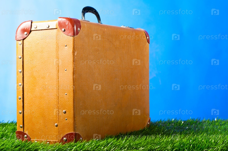 Старый чемодан на траве, на голубом фоне