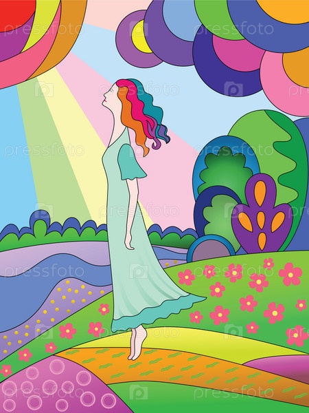 Девушка на поляне в лучах солнца