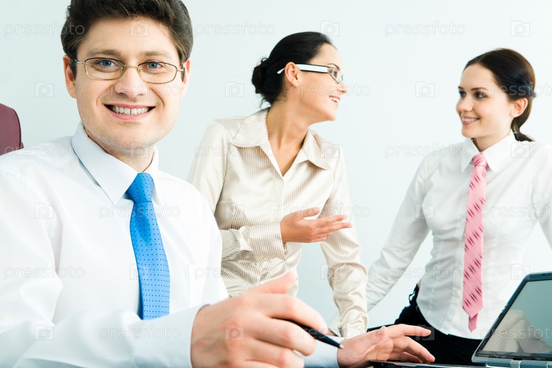 Портрет успешного бизнесмена с очками на фоне говорящих женщин