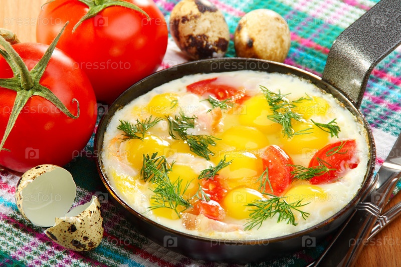 Яичница-глазунья из перепелиных яиц с беконом, помидорами и зеленью на столе