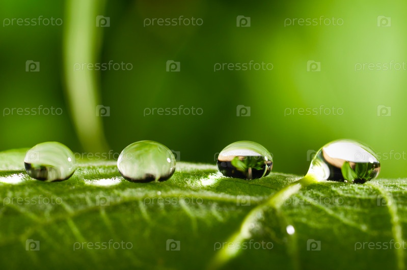 Капли воды на свежем зеленом листе на размытом фоне