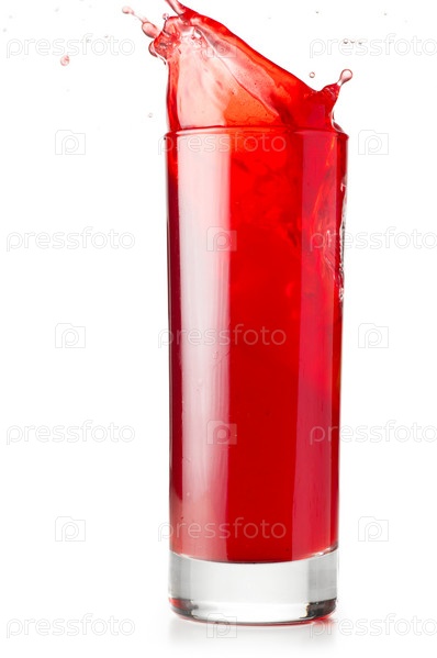 Красная жидкость плещется в стеклянном стакане, на белом фоне