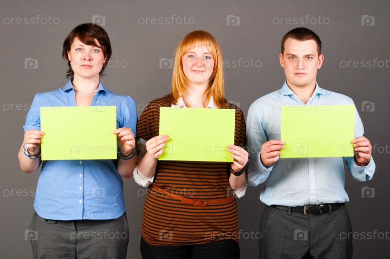 Трое деловых людей держат пустые листы бумаги, стоя на сером фоне