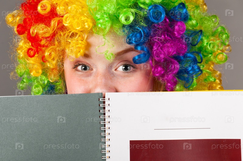 Женщина в разноцветном курчавом парике выглядывает из-за тетради