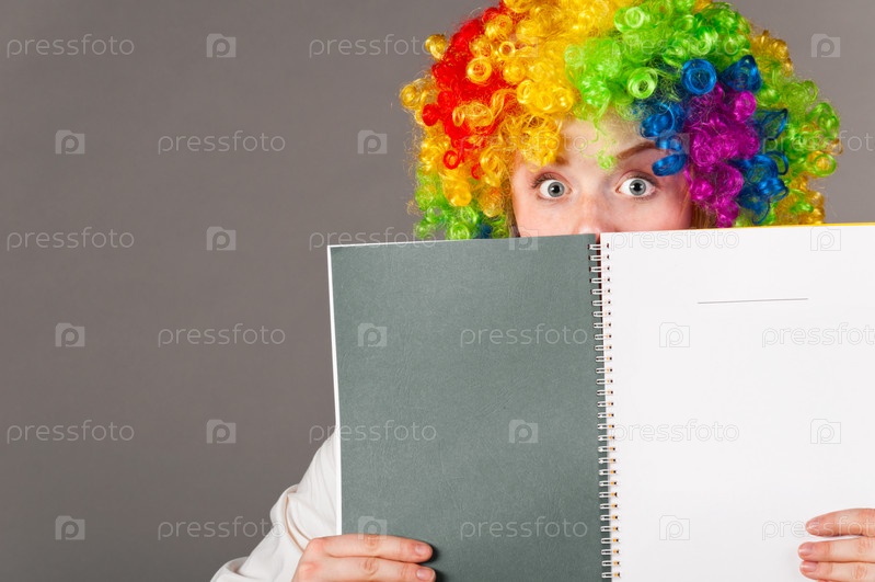 Удивленная женщина в разноцветном курчавом парике выглядывает из-за тетради