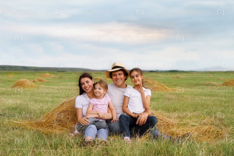 Счастливая молодая семья с двумя дочерьми в поле