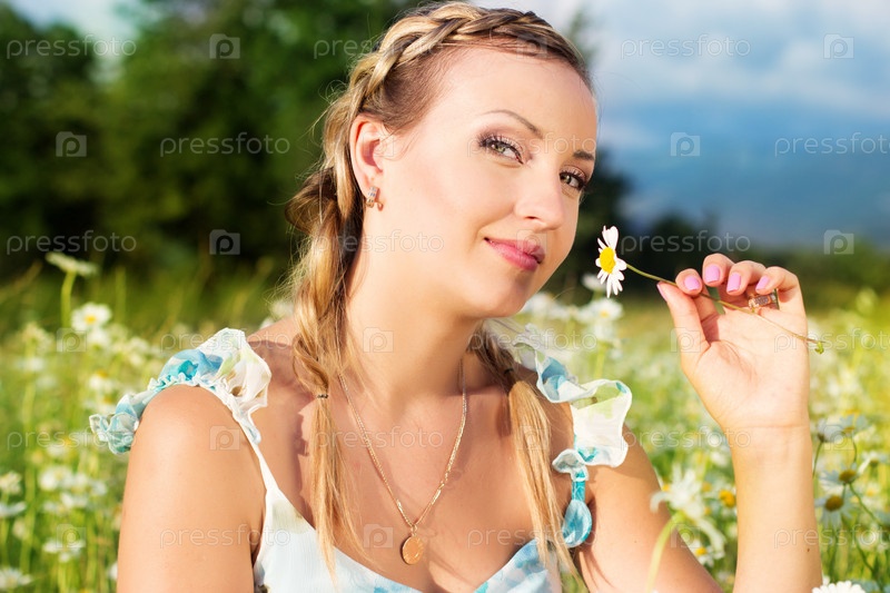 Красивая женщина на поляне с ромашками