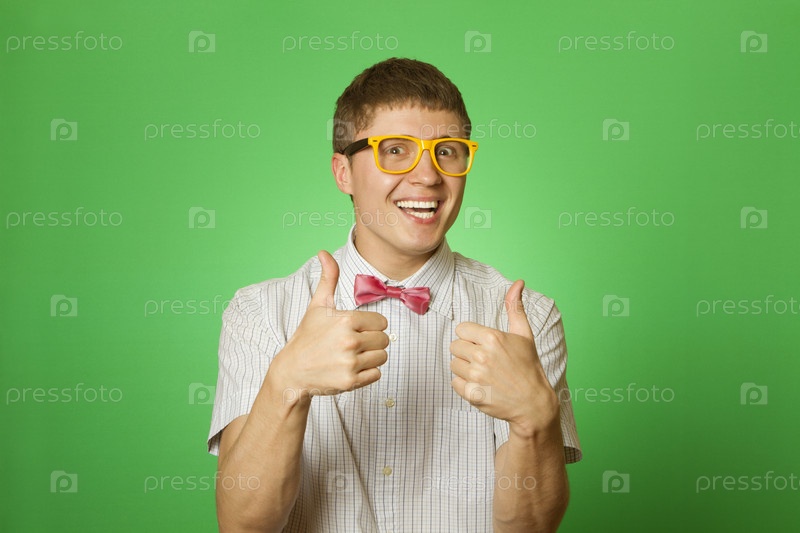 Радостный мужчина в галстуке-бабочке и больших очках показывает два больших пальца вверх