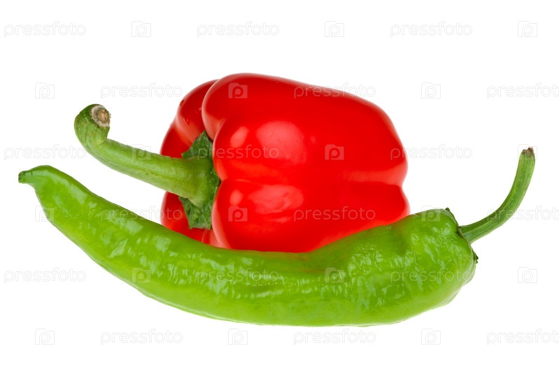 Зеленый перец чили и красный болгарский перец на белом фоне