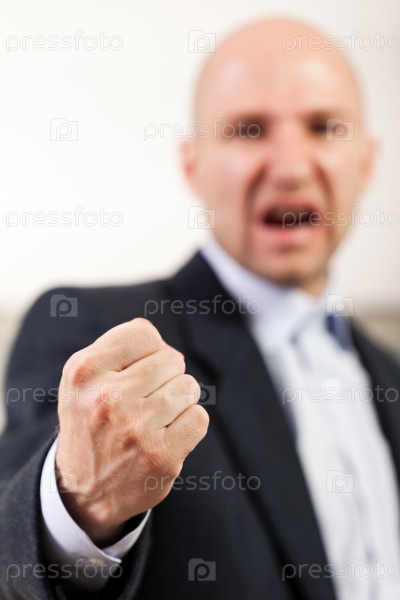 Раздраженный деловой мужчина грозит кулаком