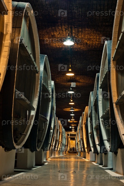 Деревянные бочки с вином в подвале