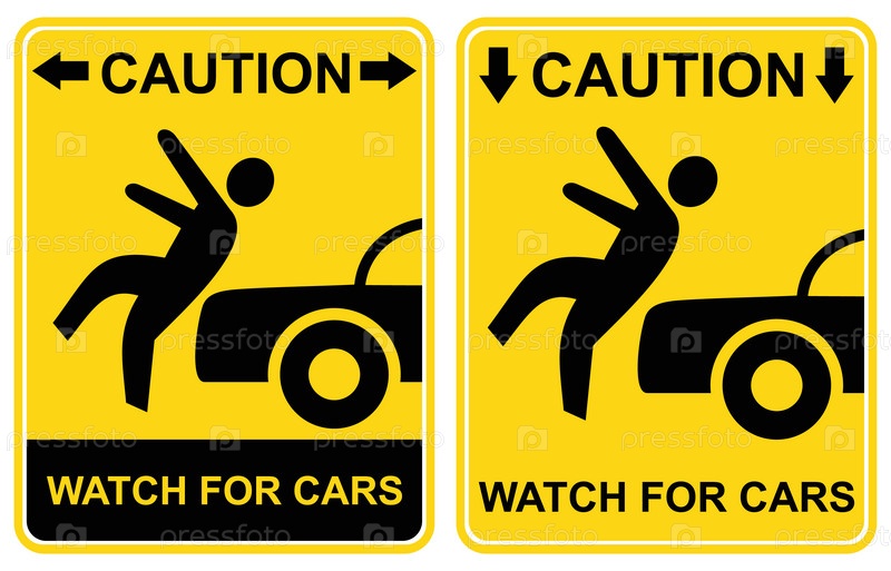 Пешеходный знак - Осторожность, следите за автомобилями (Предупреждение - автомобили; внимание, опасность - следите за движением). желтый и черный векторные значки