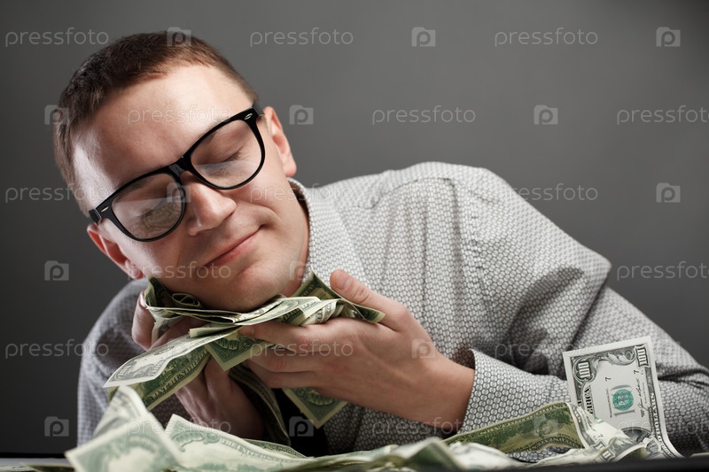 Молодой счастливый мужчина, прижимающий доллары к лицу на сером фоне