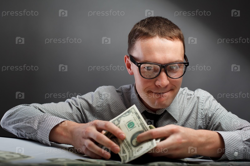 Молодой счастливый мужчина с долларами в руках на сером фоне