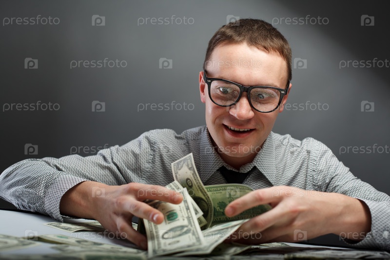 Молодой счастливый мужчина с долларами в руках на сером фоне
