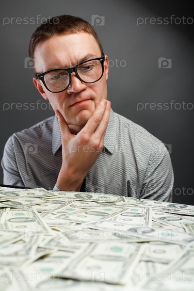 Молодой озадаченный мужчина, смотрящий на доллары на сером фоне